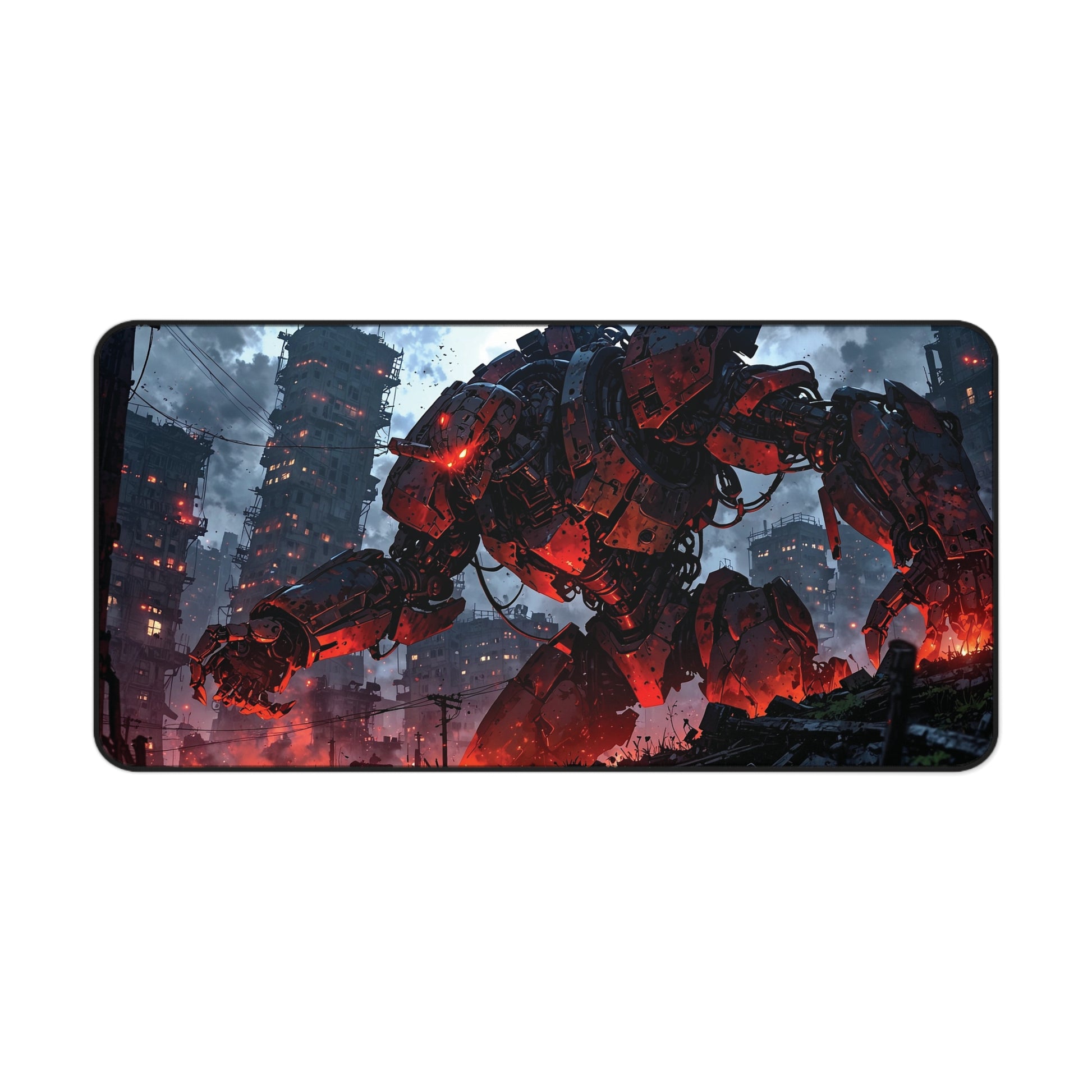 Dominate your workspace with this high-intensity mecha desk mat, featuring a towering war machine engulfed in fire and destruction, rampaging through a cyberpunk city in ruins. The massive red-glowing mechanical beast, covered in battle scars and molten metal, is a force of pure devastation, illuminated by the embers of a crumbling dystopian skyline.