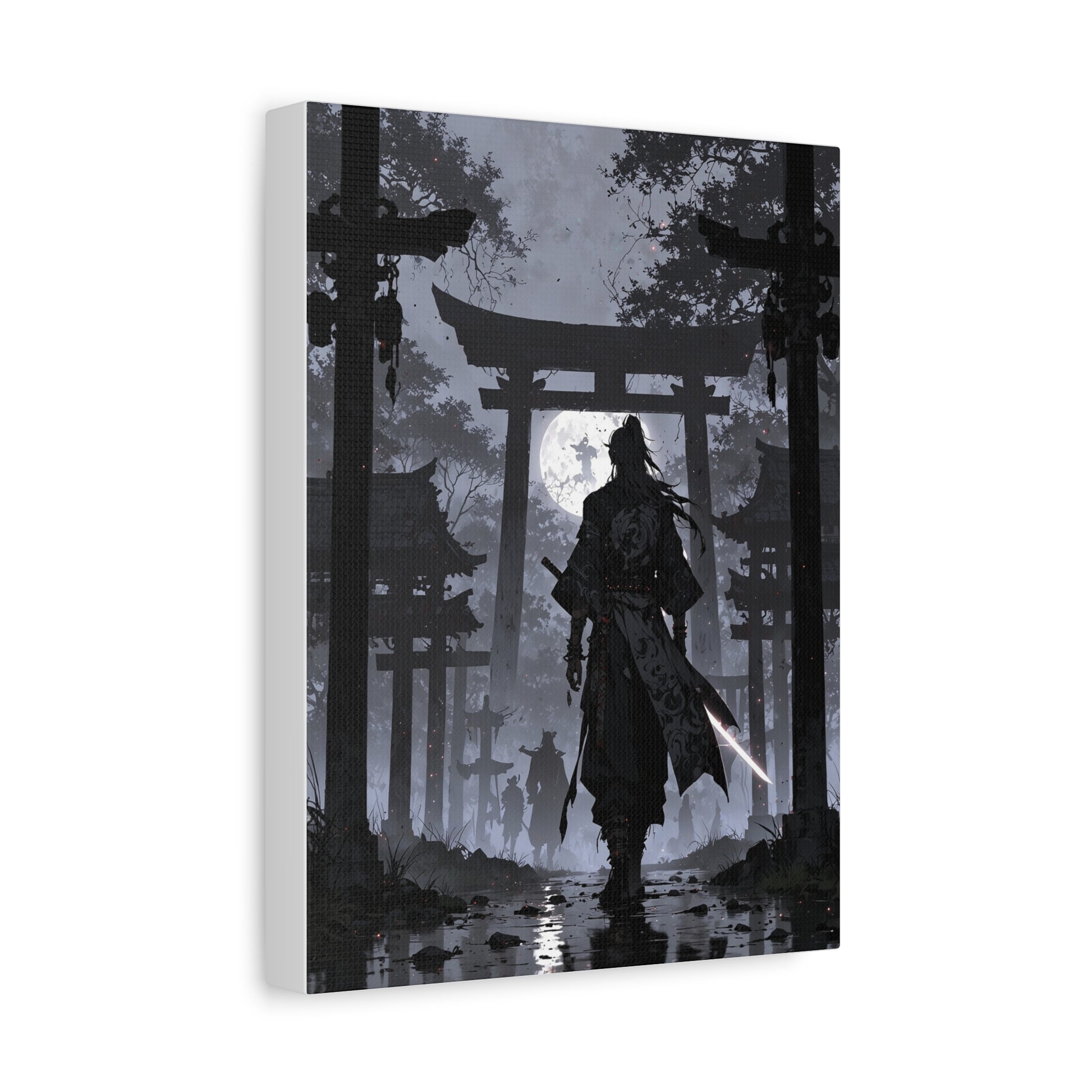 The moon casts a pale glow over an ancient torii gate as a lone samurai warrior strides forward, his katana gleaming in the darkness. Behind him, ghostly figures lurk in the mist, their presence foreboding. Above, a shadowy ninja assassin perches against the full moon, waiting for the perfect moment to strike.